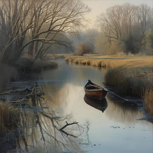 “A lonely wooden boat rests gently upon the still waters,